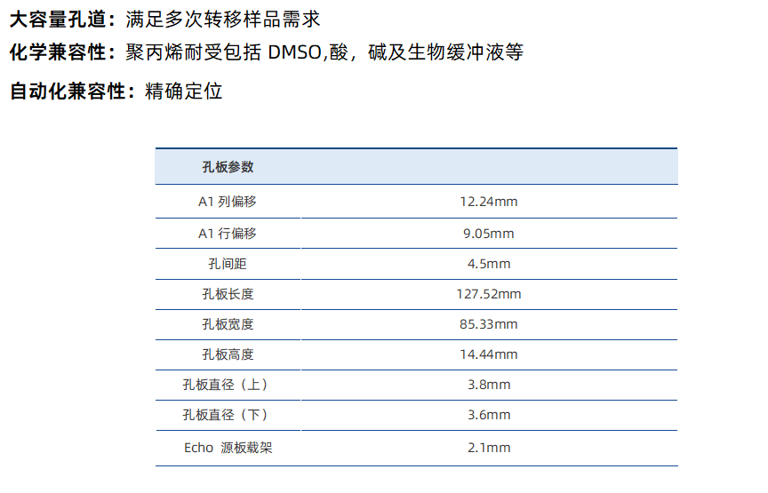 KeyTec® 384 孔自然色微孔板专为储存样品和声波移液设计,采用圆角方形孔结构,孔道通常比标准检测板具有更大的容积,以满足多次转移样品或重复实验的需求。适用于搭配ECHO全系列声波液体处理系统使用。