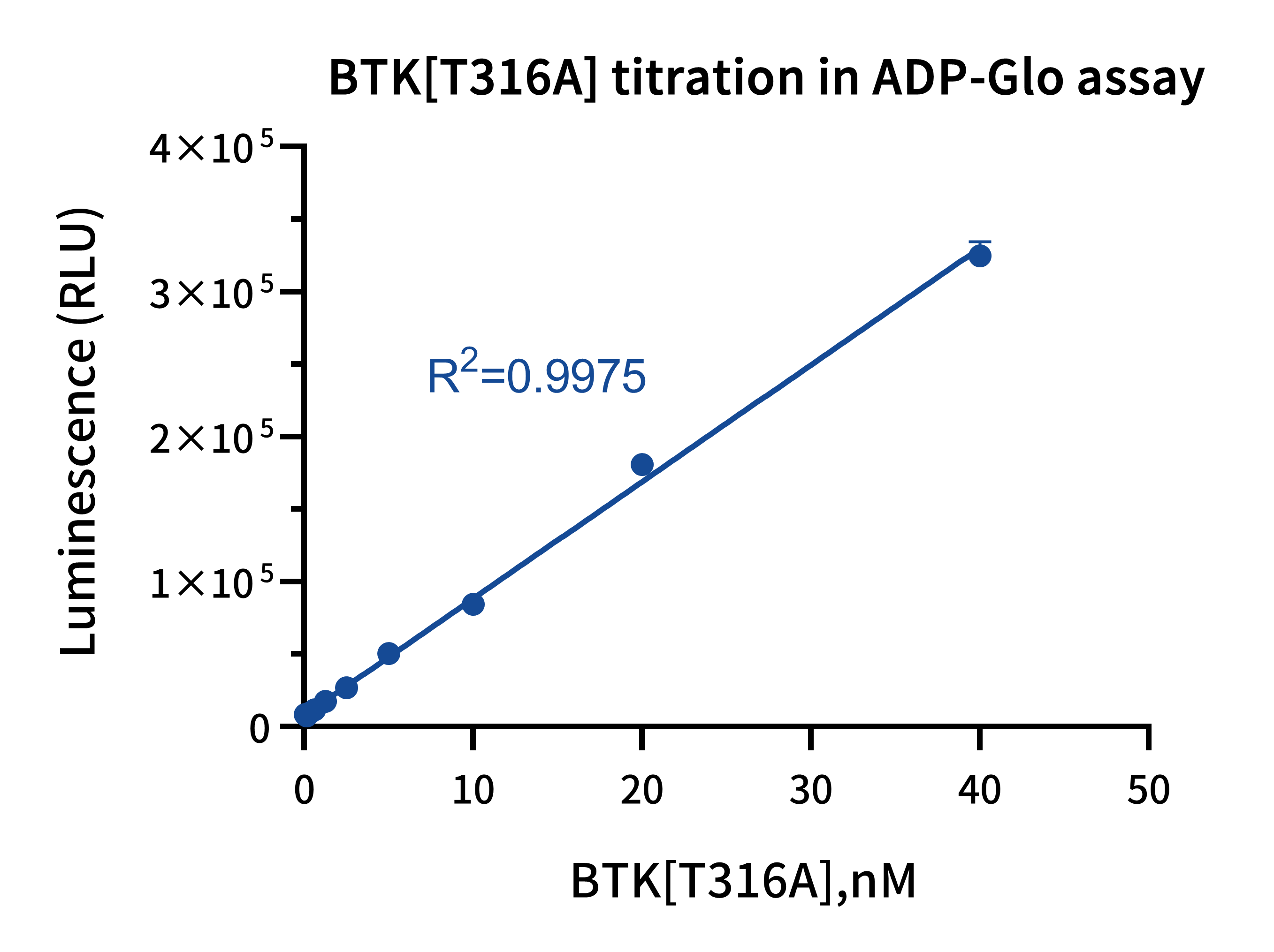 KeyTec® BTK[T316A], N-GST重组蛋白的N端连接了GST标签,使用GST亲和层析纯化。经过ADP-Glo方法的验证,该批次BTK[T316A]蛋白具有很高的酶活性。
