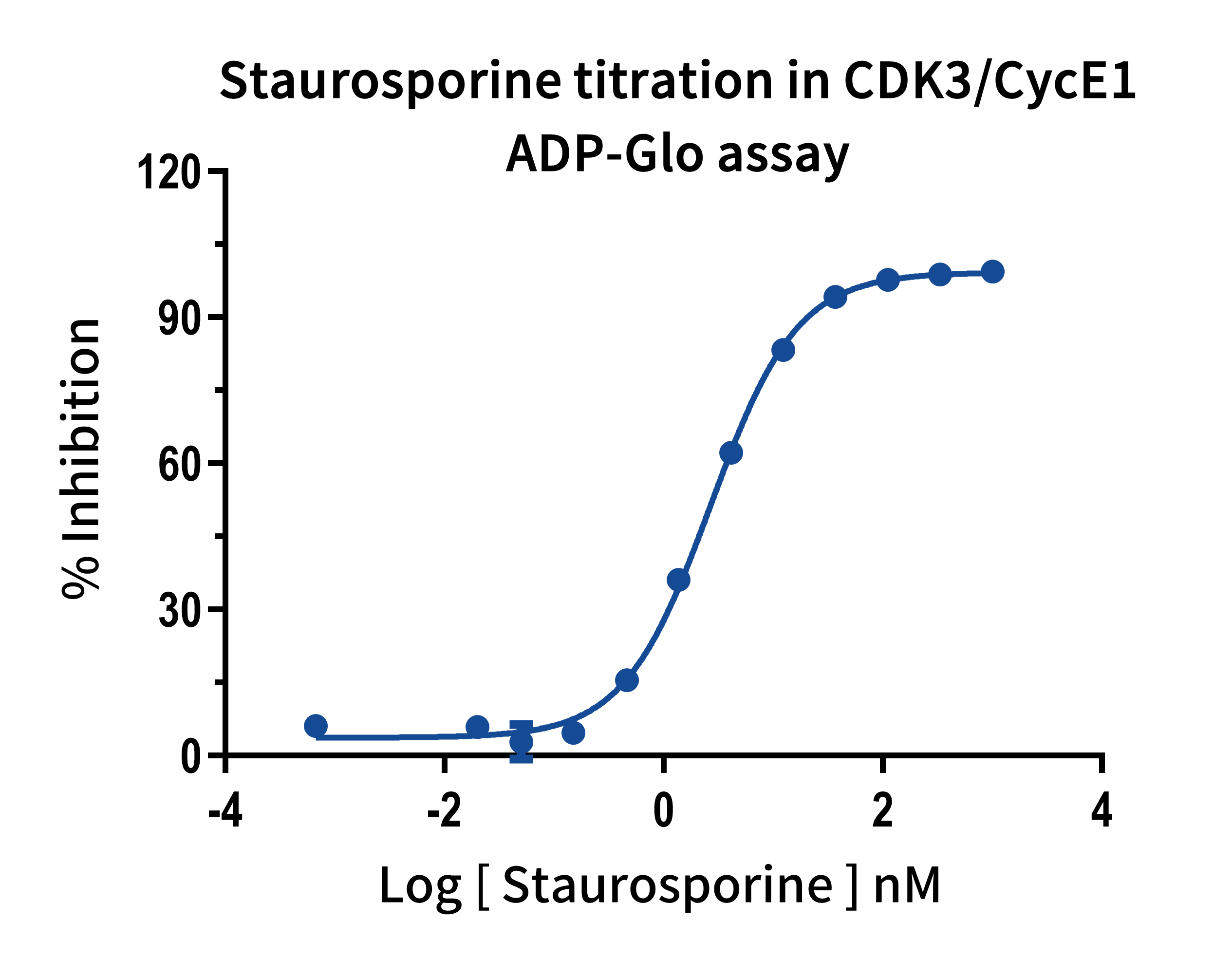 KeyTec® CDK3/CycE1,N-GST重组蛋白中CDK3和CycE1的N端均连接了GST标签及TEV酶切位点,使用GST亲和层析纯化并通过SEC色谱分析蛋白聚合状态。SEC-HPLC结果显示CDK3/CycE1蛋白在溶液中为多聚体。经过ADP-Glo方法的验证,该批次CDK3/CycE1蛋白具有很高的酶活性。