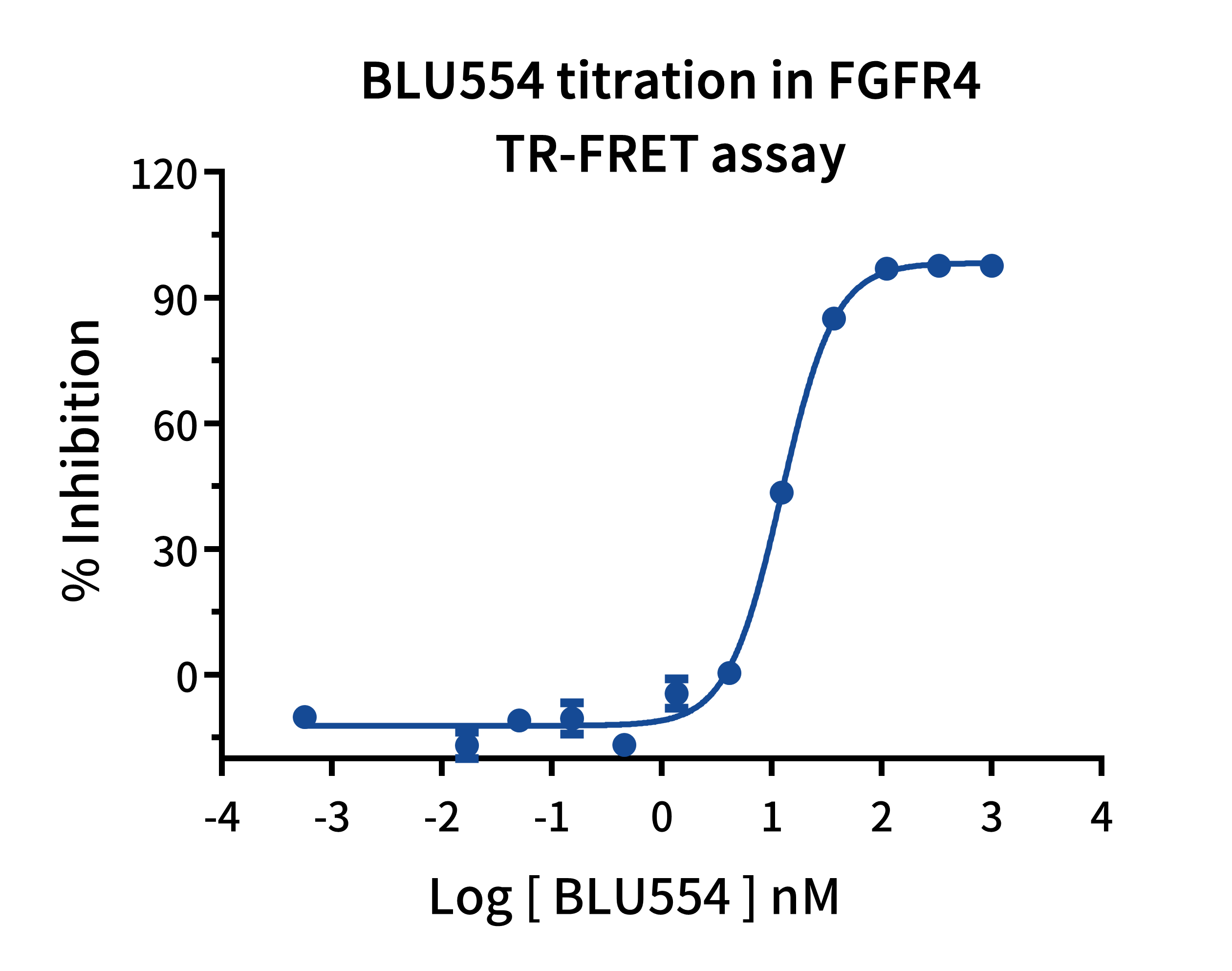 KeyTec® FGFR4, N-GST重组蛋白的N端连接了GST标签及TEV酶切位点,使用GST亲和层析纯化并通过SEC色谱分析蛋白聚合状态。经过TR-FRET方法的验证,该批次FGFR4蛋白具有很高的酶活性。