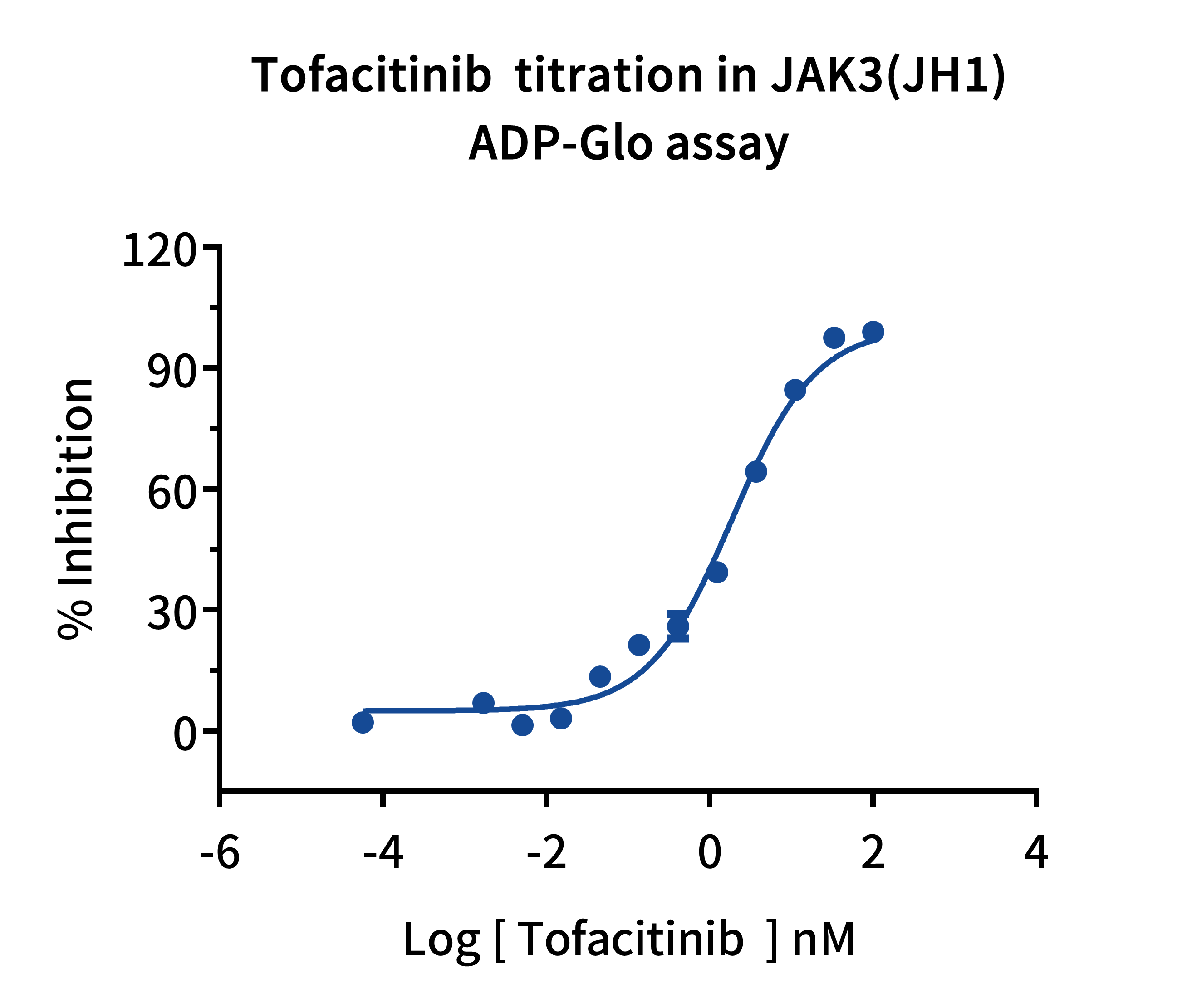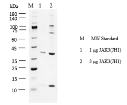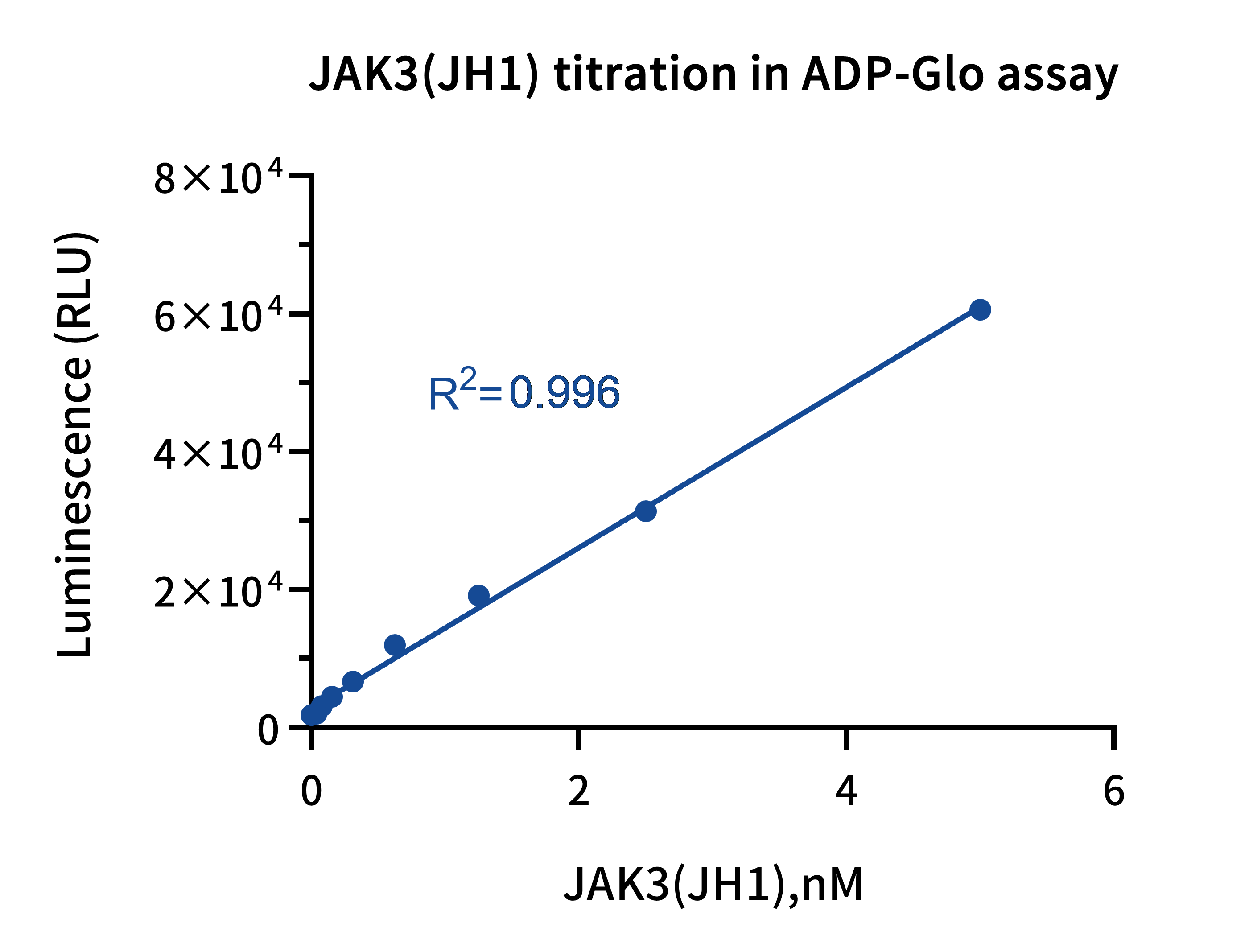 KeyTec® JAK3(JH1), N-His重组蛋白的N端连接了8x His标签,使用Ni-NTA亲和层析纯化。经过ADP-Glo方法的验证,该批次JAK3(JH1)蛋白具有很高的酶活性。