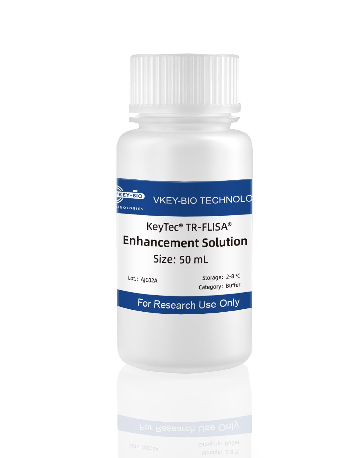 KeyTec® TR-FLISA® Enhancement Solution是一种含螯合剂和去污剂的酸性溶液,用于时间分辨荧光免疫分析法(TR-FLISA: Time-Resolved Fluorescence Linked Immunosorbent Assay)中测定最终实验体系中Eu3+/Sm3+偶联物含量。Eu3+/Sm3+标记试剂常用于蛋白质、肽和寡核苷酸等大分子标记,所得到的标记物适用于基于固相分离的各种类型的分析。经过一系列操作步骤,在洗去未结合的部分后,剩余含Eu3+/Sm3+的标记物被固定到微孔板上。然后加入该溶液,能在几分钟内将Eu3+/Sm3+从固相结合的标记抗体或蛋白质中解离出来,形成具有极高亮度的时间分辨荧光胶束螯合溶液。使用含时间分辨荧光模块的仪器,即可进行高灵敏度的Eu3+/Sm3+测量。由于该溶液使Eu3+/Sm3+解离至溶液中并产生增强的时间分辨荧光信号,因此实验背景信号低,测量上限高,从而获得较高信噪比和灵敏度。