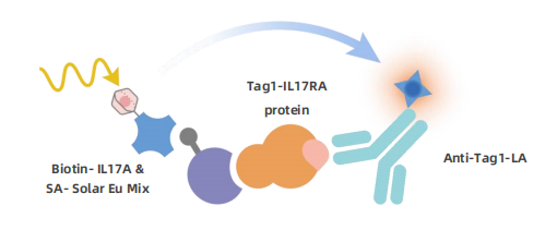 本方法的基本原理如下图所示,KeyTec® TR-FRET Solar Eu*1偶联的Streptavidin (后文缩写为SA)和生物素化的Human IL17A蛋白(AVI-Biotin)预结合形成复合物,KeyTec® TR-FRET LA*2偶联的IL17RA蛋白。当IL17A与IL17RA结合时,分别偶联了Solar Eu和LA的标签抗体或亲和试剂因而相互靠近,在外部光源的激发下,供体与受体之间发生能量共振转移;检测特定波长(665 nm)的信号强度即可测定IL17A与IL17RA蛋白之间相互作用的程度。因此,阻断IL17A与IL17RA相互作用的化合物、多肽或抗体则会导致TR-FRET信号降低。