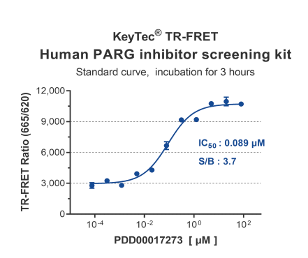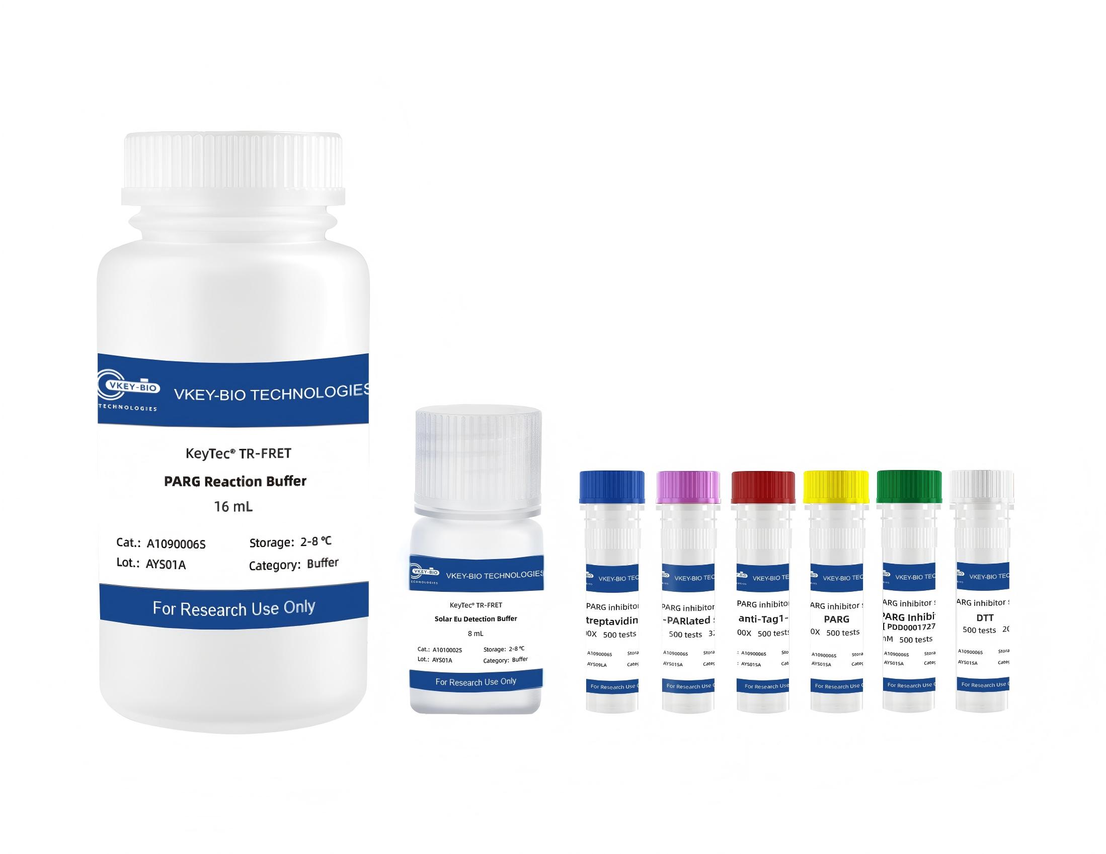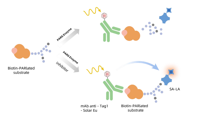 KeyTec® TR-FRET HumanPARG抑制剂筛选试剂盒可筛选PARG酶的抑制剂。本试剂盒是运用KeyTec®TR-FRET 技术开发的免疫分析方法,具有简单快速、准确性高、重复性好等特点。本方法的基本原理如下图所示,KeyTec®TR-FRETSolarEu*1偶联的抗标签1(Tag1) 抗体与KeyTec®TR-FRET LA*2偶联的 Streptavidin 可与带 Tag1的 Biotin-PARlated蛋白底物结合,从而使 SolarEu和 LA 相互靠近,在外部光源的激发下,供体与受体之间发生能量共振转移,检测特定波长(665nm)的信号强度即可测定Biotin-PARlated蛋白底物浓度。PARG酶可水解蛋白底物上连接的生物素化聚ADP核糖链,当体系中含有PARG酶抑制剂时,可阻碍PARG酶作用,TR-FRET的信号强度与样本中抑制剂浓度成正比。