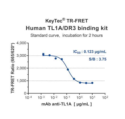 KeyTec® TR-FRET Human TL1A/DR3结合检测试剂盒可筛选TL1A和DR3结合的抑制剂。本试剂盒是运用KeyTec® TR-FRET技术开发的竞争型免疫分析方法,具有简单快速、准确性高、重复性好等特点。