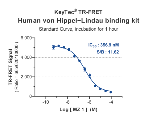 KeyTec® TR-FRET人源von Hippel−Lindau蛋白结合检测试剂盒可测定针对野生型人源von Hippel−Lindau (VHL) 蛋白的配体或抑制剂结合情况。本试剂盒是运用KeyTec® TR-FRET技术开发的竞争型免疫分析方法,具有简单快速、特异性高、灵敏度高、重复性好等特点。试剂盒中使用了带标签1的VHL/Elongin C/Elongin B蛋白复合体(Tag1-VHL/Elongin C/Elongin B protein complex, 后续使用缩写Tag1-VCB complex表示)和偶联了KeyTec® TR-FRET LA*1的VHL ligand (CAS# 1948273-02-6,可募集VHL蛋白,并可用于合成PROTAC,如MZ 1)。本试剂盒可用于VHL抑制剂或配体的高通量筛选与亲和力测定。