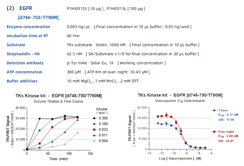 KeyTec® TR-FRET Revamped TKs kinase检测试剂盒可检测激酶相对活性水平。试剂盒中使用一种酪氨酸激酶通用底物和一组通用检测试剂来测定激酶的相对活性。本试剂盒也可搭配药科元优化设计的多种酪氨酸特异性底物使用。酪氨酸激酶(Tyrosine kinases, TKs)家族成员众多,本试剂盒可兼容60种以上酪氨酸激酶的活性测定(数据持续更新中,详情访问官网或咨询客服)。本试剂盒中使用了经过优化设计的生物素偶联多肽作为底物,可与KeyTec® TR-FRET HX*1偶联的链霉亲和素(Streptavidin - HX)结合;配合偶联了KeyTec® TR-FRET Solar Eu*2的抗phospho-Tyr特异性抗体一起使用,即可通过检测被磷酸化底物的水平来评估相对酶活或抑制剂性能。