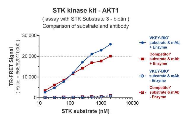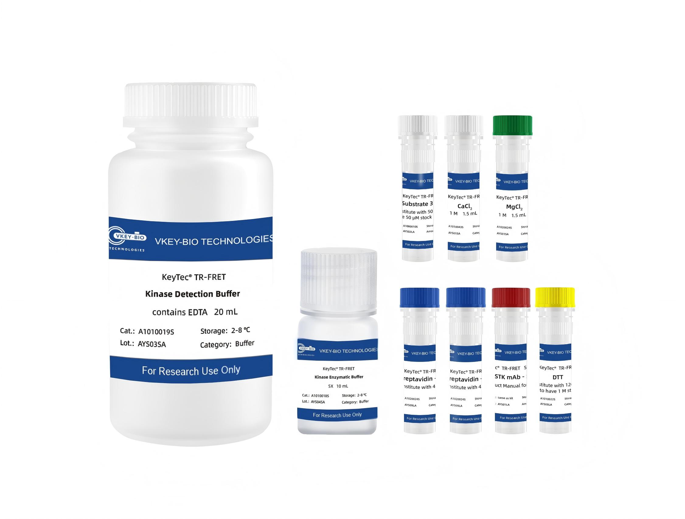KeyTec® TR-FRET STK S3 kinase检测试剂盒可检测激酶相对活性水平。试剂盒中使用1种丝氨酸/苏氨酸激酶底物和一组通用检测试剂来测定激酶的相对活性。丝氨酸/苏氨酸激酶(Serine/threonine kinase, STK)家族成员众多,本试剂盒可兼容50种以上丝氨酸/苏氨酸激酶的活性测定。本试剂盒中使用了经过优化设计的生物素偶联多肽作为底物,可与KeyTec® TR-FRET HX*1偶联的链霉亲和素(Streptavidin - HX)结合;配合偶联了KeyTec® TR-FRET Solar Eu*2的phospho-STK*3 特异性抗体一起使用,即可通过检测被磷酸化底物的水平来评估酶的活性。
