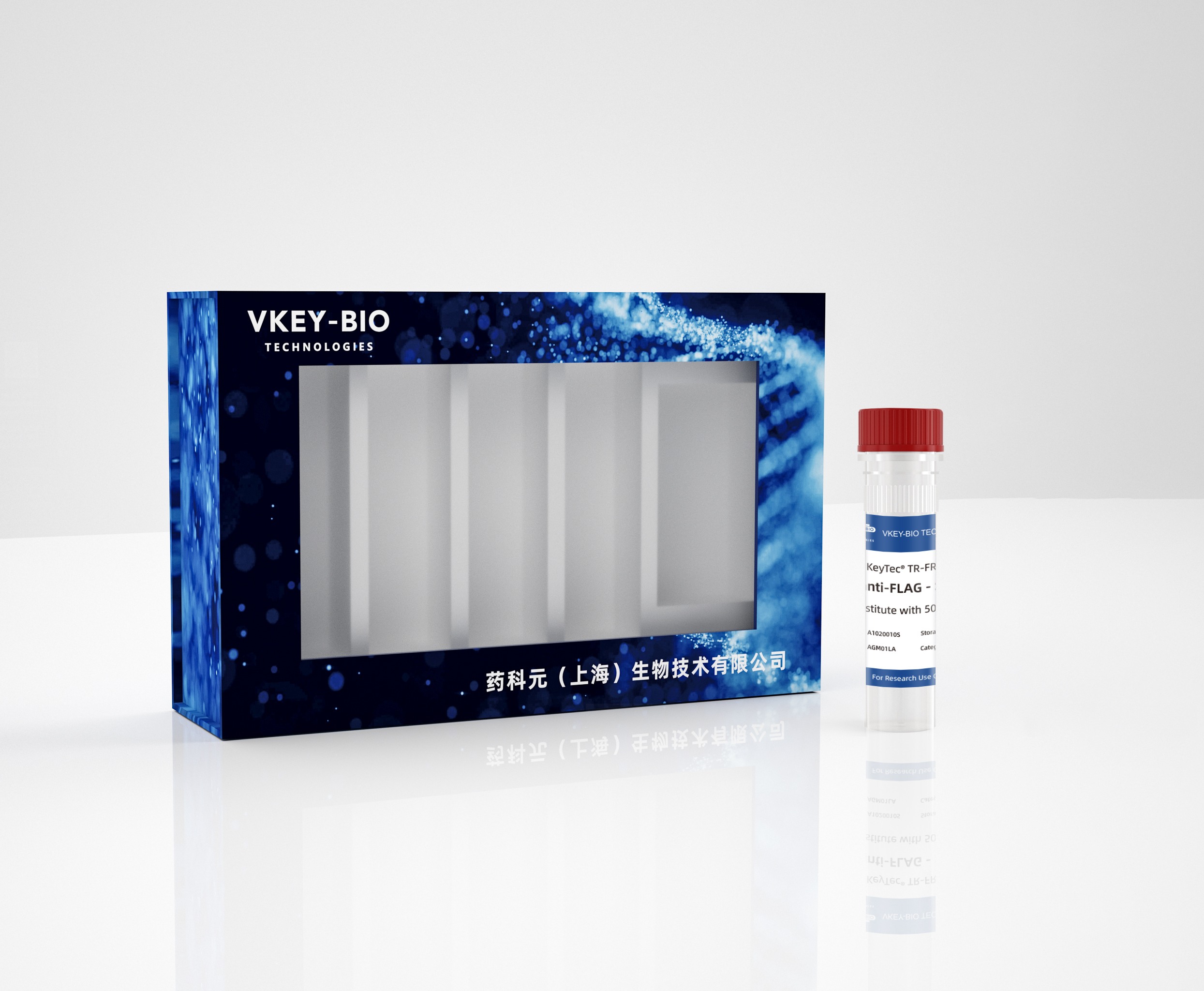 KeyTec® TR-FRET Solar Tb*1 偶联的兔抗FLAG标签抗体(Rabbit mAb anti-FLAG tag)可用于TR-FRET分析方法的构建。以蛋白-蛋白相互作用检测模型为例,当需要检测带有FLAG标签(FLAG Tag)的蛋白A 和带有氨酸标签(HIS Tag)的蛋白B之间的互作情况时,KeyTec® TR-FRET Solar Tb*1 偶联的抗FLAG标签抗体和KeyTec® TR-FRET Acceptor*2 偶联的抗组氨酸标签抗体会因蛋白互作而靠近,通过外部光源激发供体实现与受体之间的能量共振转移(FRET),可在665 nm或 520 nm处读取特定信号。这个特定信号的强度与蛋白互作的程度成正比。此类模型可用于筛选蛋白-蛋白互作的抑制剂或阻断剂(化合物、抗体等)。