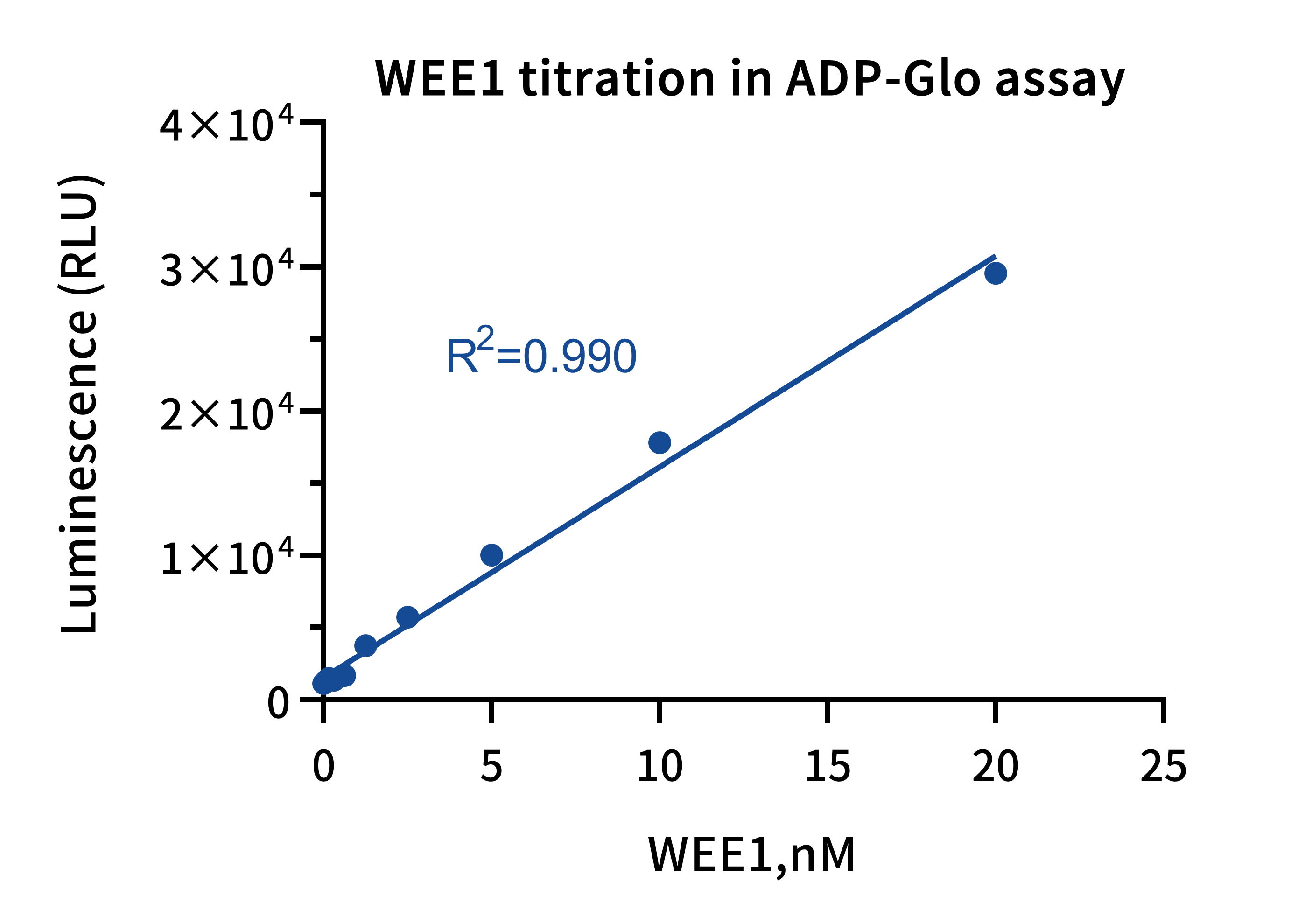 KeyTec® WEE1, N-GST重组蛋白的N端连接了GST标签,使用GST亲和层析纯化。经过ADP-Glo方法的验证,该批次WEE1蛋白具有很高的酶活性。