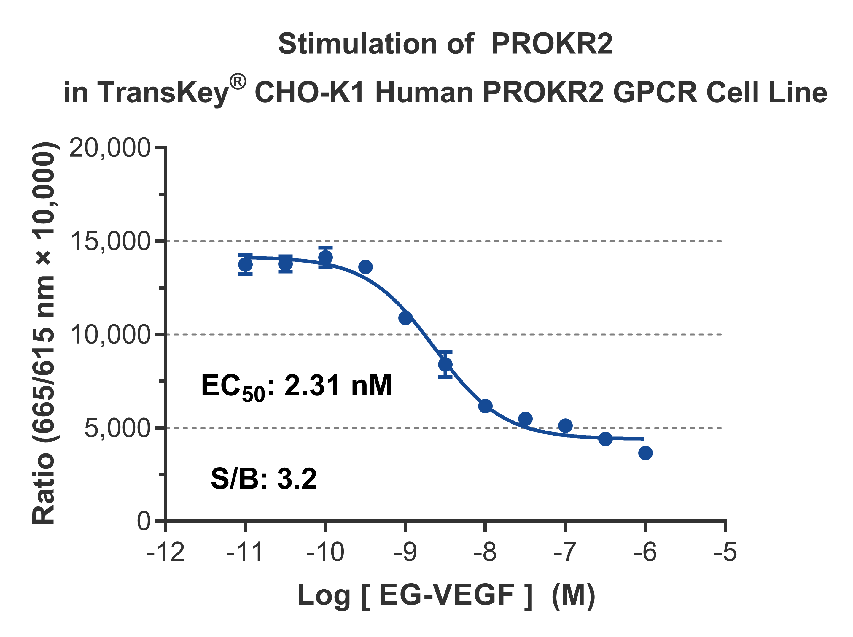TransKey® CHO-K1 Human PROKR2 GPCR细胞株是在宿主细胞CHO-K1上过表达人源前动力蛋白受体2(Prokineticin receptor 2,PROKR2),通过检测胞内IP-1的增加量衡量受体激动剂的激动效果。功能试验采用HTRF IP-1试剂盒(Cisbio)进行信号检测。