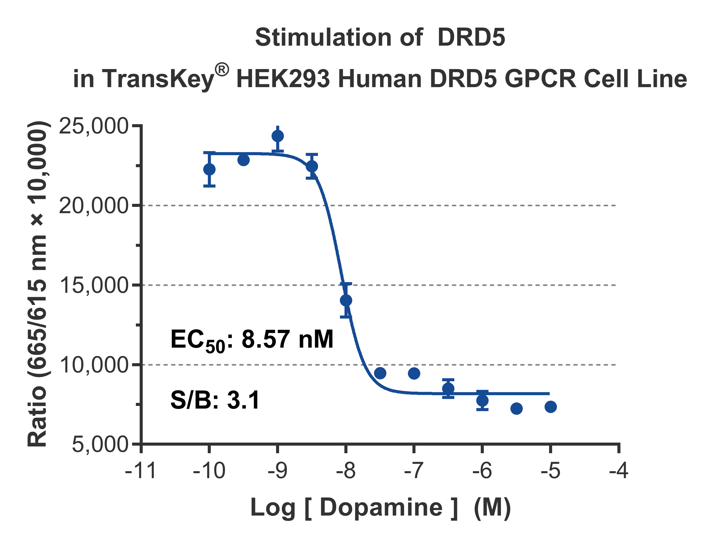 TransKey® HEK293 Human DRD5 GPCR细胞株是在宿主细胞HEK293上过表达人源多巴胺受体D5(Dopamine receptor D5,DRD5),通过检测胞内cAMP的增加量衡量受体激动剂的激动效果。功能试验采用HTRF cAMP试剂盒(Cisbio)进行信号检测。