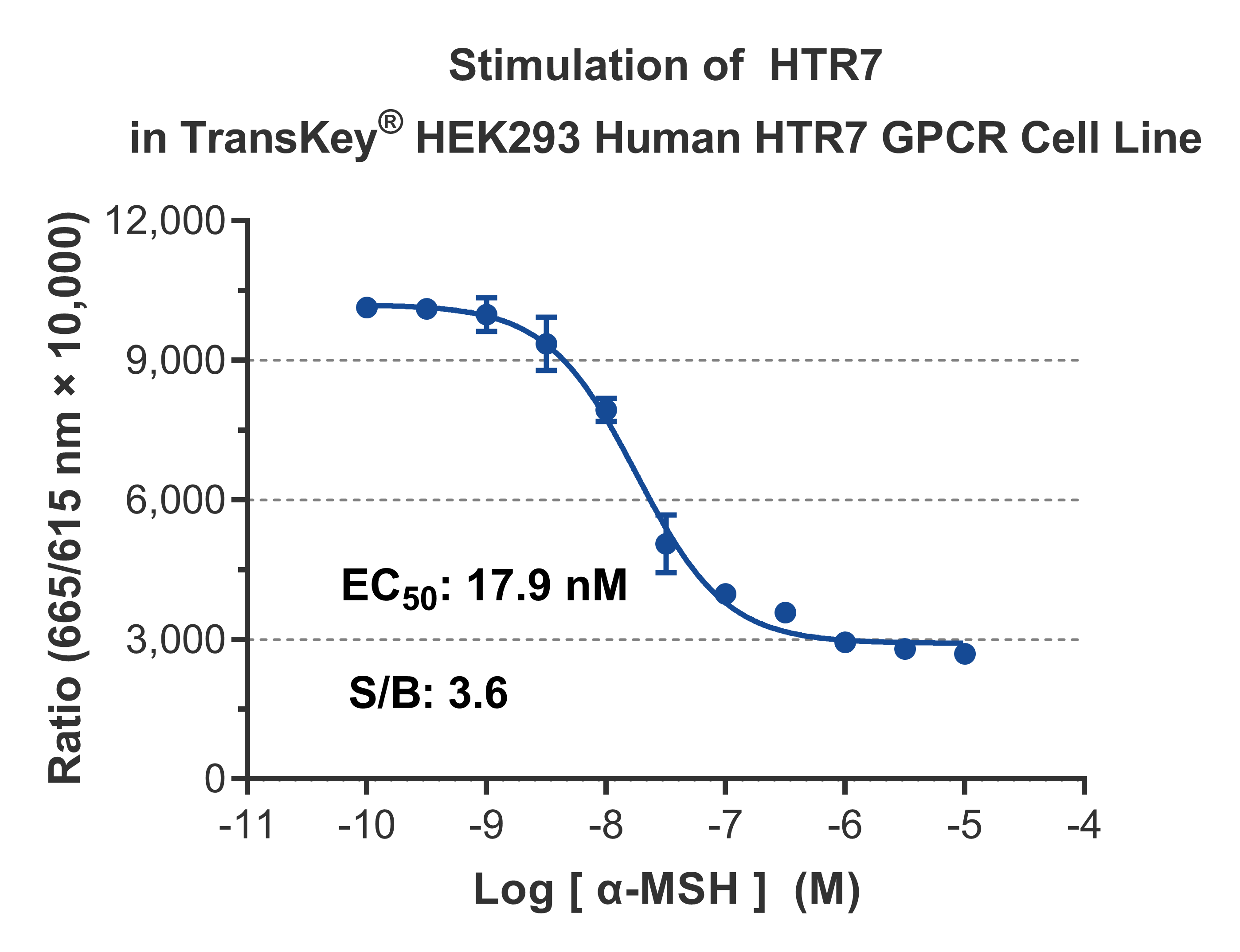 TransKey® HEK293 Human HTR7 GPCR细胞株是在宿主细胞HEK293上过表达人源血清素7受体(Serotonin receptor 7, HTR7),通过检测胞内cAMP的增加量衡量受体激动剂的激动效果。功能试验采用HTRF cAMP试剂盒(Cisbio)进行信号检测。